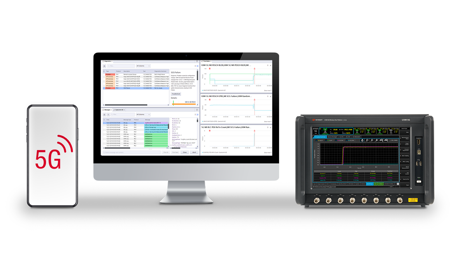 这个设备故障诊断套件包括用于分析和报告的 Keysight Nemo 5G 设备分析软件、用于设备控制和诊断的 Nemo Outdoor 软件或 QXDM,以及用于网络信号仿真的 Keysight UXM 5G 无线测试平台。